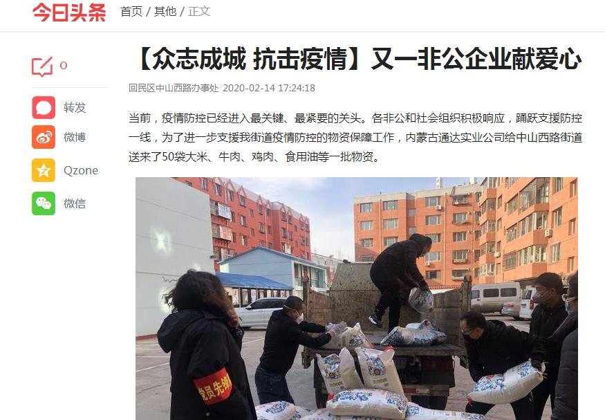 在新型冠狀病毒肺炎疫情肆虐神州大地之時(shí),在這個(gè)特殊的時(shí)期里,每個(gè)人都卷入了一場(chǎng)特殊的戰役。在疫情當前我們看到一批批勇敢的逆行者夜以繼日的堅守在一線(xiàn)崗位,保障著(zhù)你我健康安全,守護者大家的生活秩序。內蒙古通達實(shí)業(yè)股份有限公司強化責任擔當、積極響應、迅速行動(dòng),在做好各項防控措施的同時(shí)出資20萬(wàn)元善款,通過(guò)全市多個(gè)轄區內的街道辦事處進(jìn)行愛(ài)心物資捐贈活動(dòng),以表達通達公司對奮戰在疫情聯(lián)防聯(lián)控一線(xiàn)的工作人員最崇高的敬意!