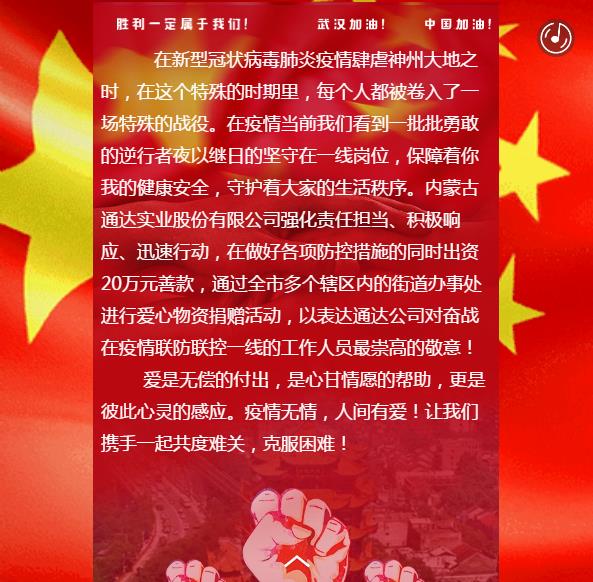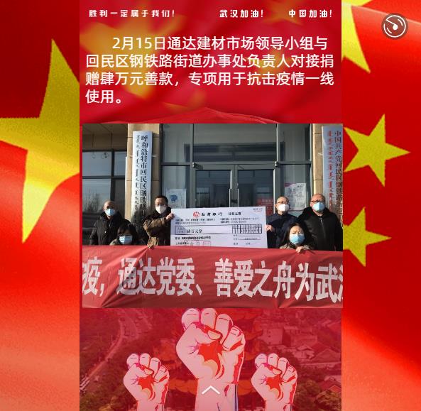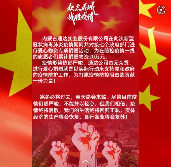 內蒙古通達實(shí)業(yè)股份有限公司在此次新型冠狀病毒肺炎疫情期間共對接7個(gè)政府部門(mén)進(jìn)行愛(ài)心物資專(zhuān)項捐贈活動(dòng),為在防控疫情一線(xiàn)的志愿者們累計捐贈20萬(wàn)元。