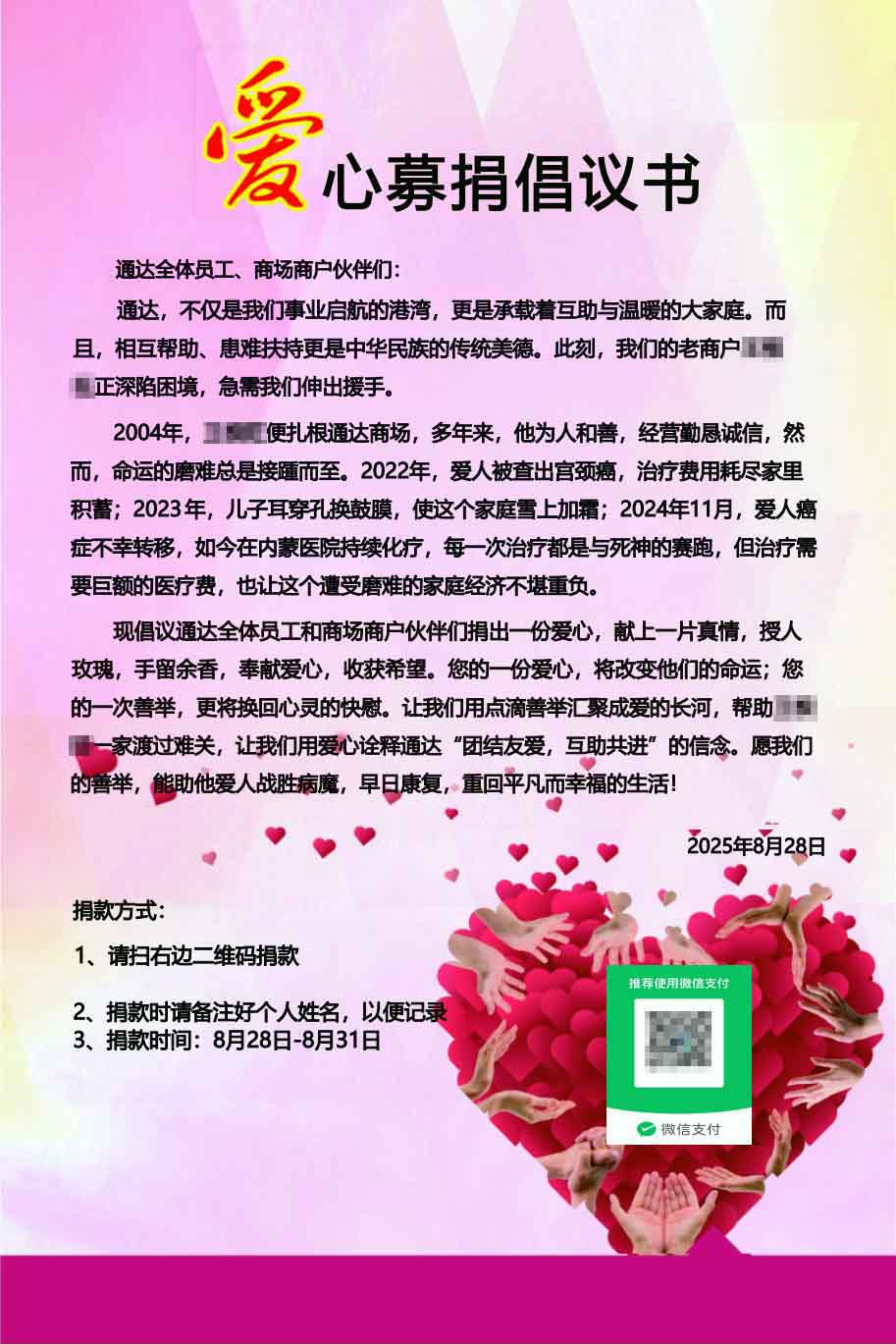 通達商場(chǎng)商戶(hù)W老板及愛(ài)人,扎根商場(chǎng)二十余年,多年來(lái),為人和善,經(jīng)營(yíng)勤懇誠信,然而,命運多舛,世事無(wú)常,2022年W老板愛(ài)人被查出宮頸癌,治療費用耗盡家里積蓄;2024年11月,癌癥不幸轉移,如今在內蒙醫院持續化療,巨額的治療費讓這個(gè)家庭已不堪重負。